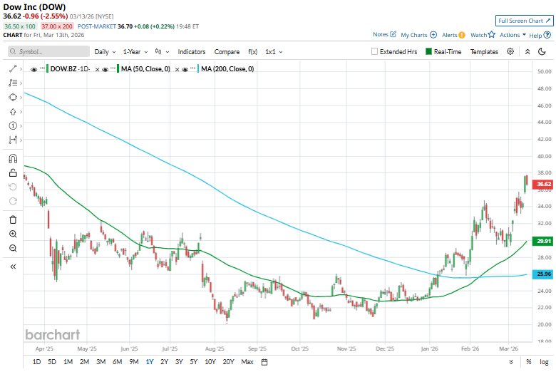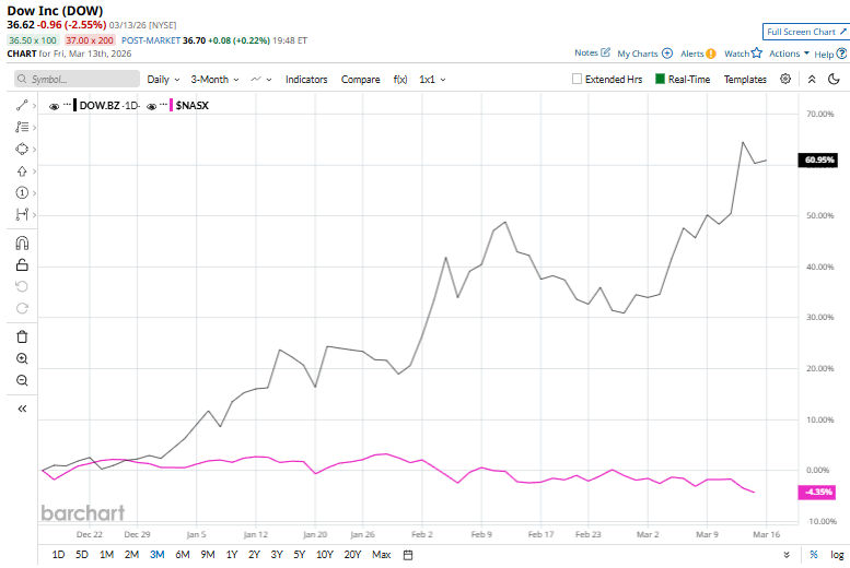 On Mar. 12, shares of Dow jumped more than 6% after Citigroup upgraded the stock to “Buy” from “Neutral” and sharply raised its price target to $40 from $28, signaling stronger confidence in the company’s outlook. The upgrade reflected Citi’s view that Dow offers “asymmetric upside risk,” particularly as geopolitical tensions in the Middle East threaten to disrupt global petrochemical supply chains.