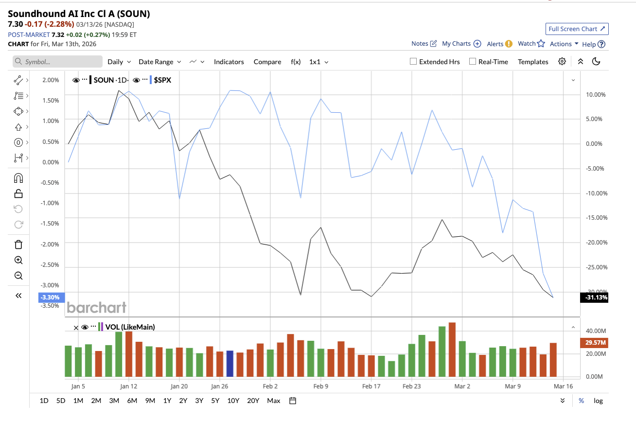 Artificial intelligence (AI) stocks have been among the biggest winners of the past few years. But many of the high-flying AI stocks have since come back down to earth as investor enthusiasm cooled in 2026. One such company is SoundHound AI (SOUN), whose stock has dropped roughly 66% from its 52-week high of $22.17 and now trades around $7, despite strong business momentum.