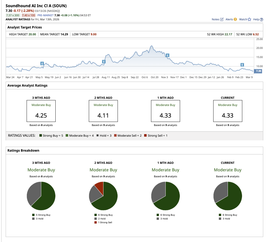 Overall, Wall Street rates SOUN stock a “Moderate Buy.” Out of the nine analysts covering SOUN, six rate it a “Strong Buy,” and three have given it a “Hold” rating. Its average target price of $14.29 suggests an upside potential of 96% from current levels. However, analysts have assigned a high price estimate of $20, which implies the stock could rally to 174% over the next 12 months.
