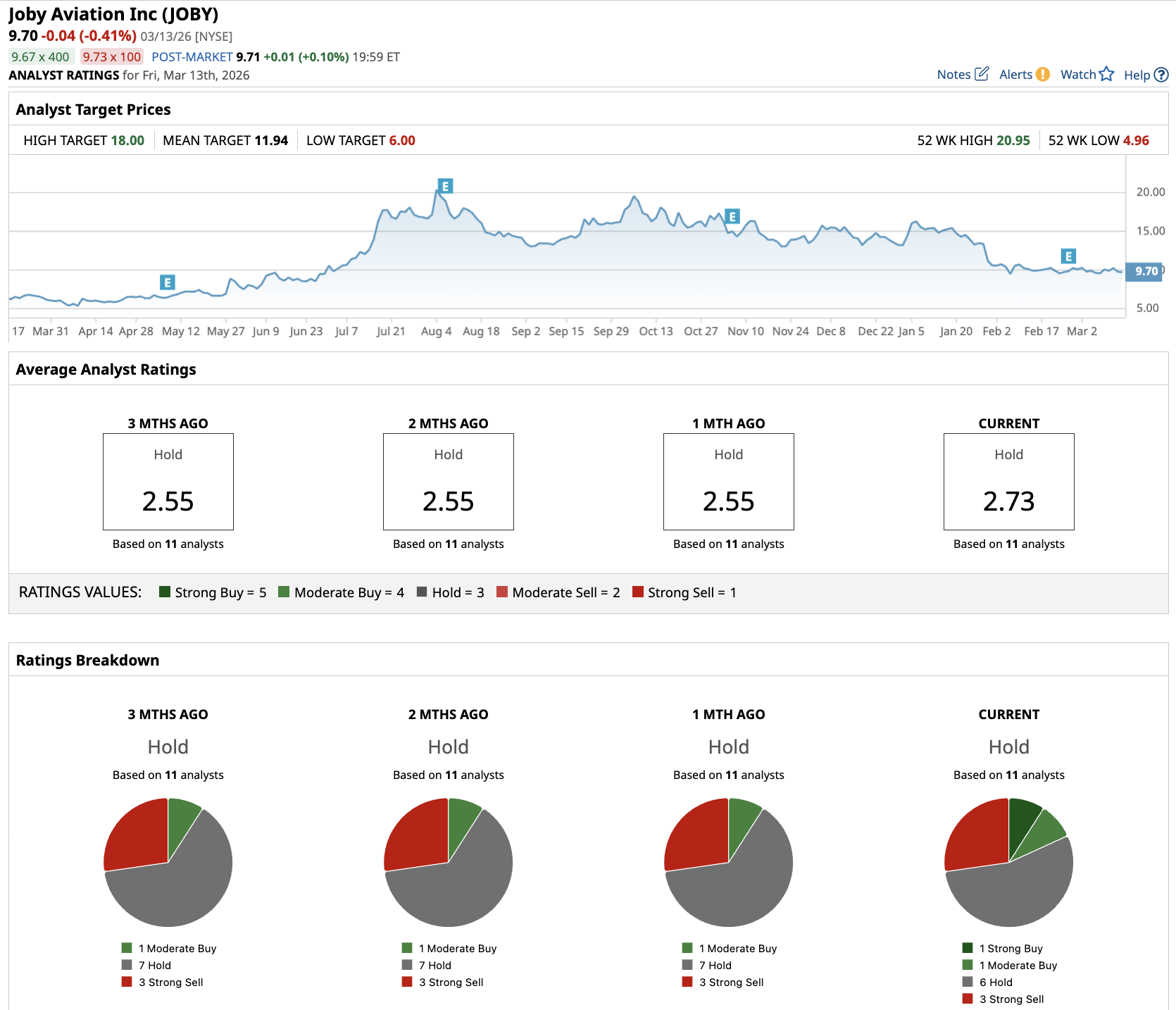 Out of the 11 analysts covering JOBY stock, one recommends “Strong Buy,” one recommends “Moderate Buy,” six recommend “Hold,” and three recommend “Strong Sell." The average JOBY stock price target is $11.94, which is above the current price of $9.70.