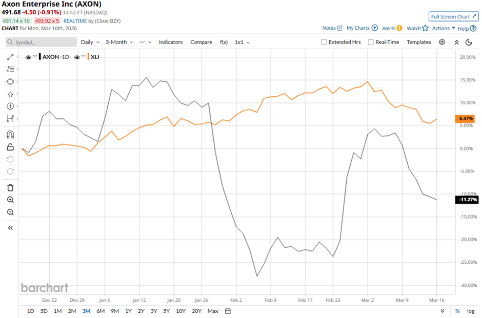 AXON stock has dropped 44.8% from its 52-week high of $885.91. Shares of the company have fallen 11.9% over the past three months, underperforming the Industrial Select Sector SPDR Fund’s (XLI) 6.2% rise over the same time frame.
