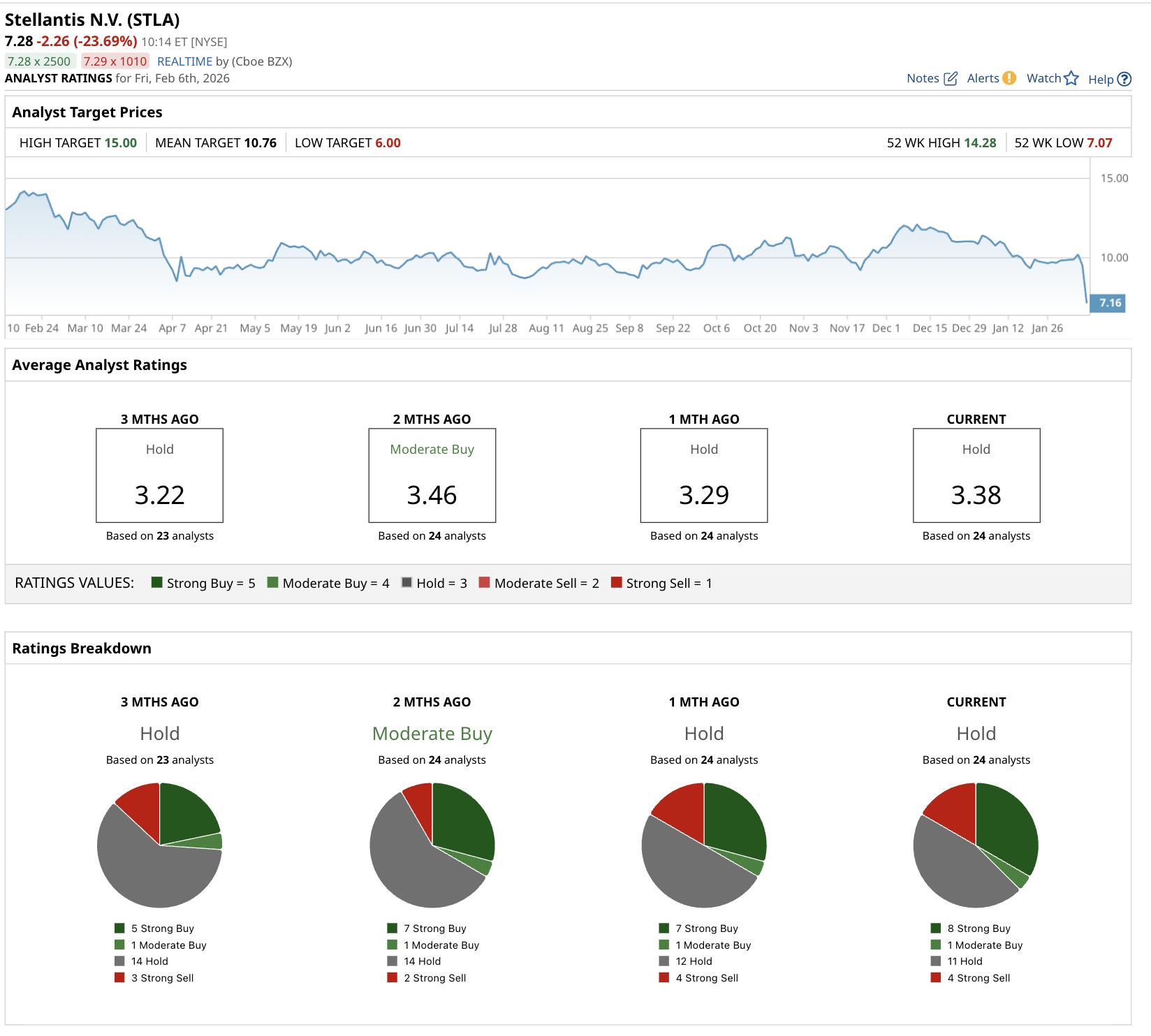 Consensus from Barchart pegs STLA at a "Hold" rating, based on 24 analysts. The breakdown sees eight analysts with a "Strong Buy" rating, one with a "Moderate Buy," 11 "Hold" ratings, and four "Strong Sell" ratings. Recent months show slight shifts, but with the write-down and EV news today, there could be major downgrades coming. Its mean target of $10.76 represents potential upside of 50% from the current $7.15 share price, but analysts may revise their targets lower after today.