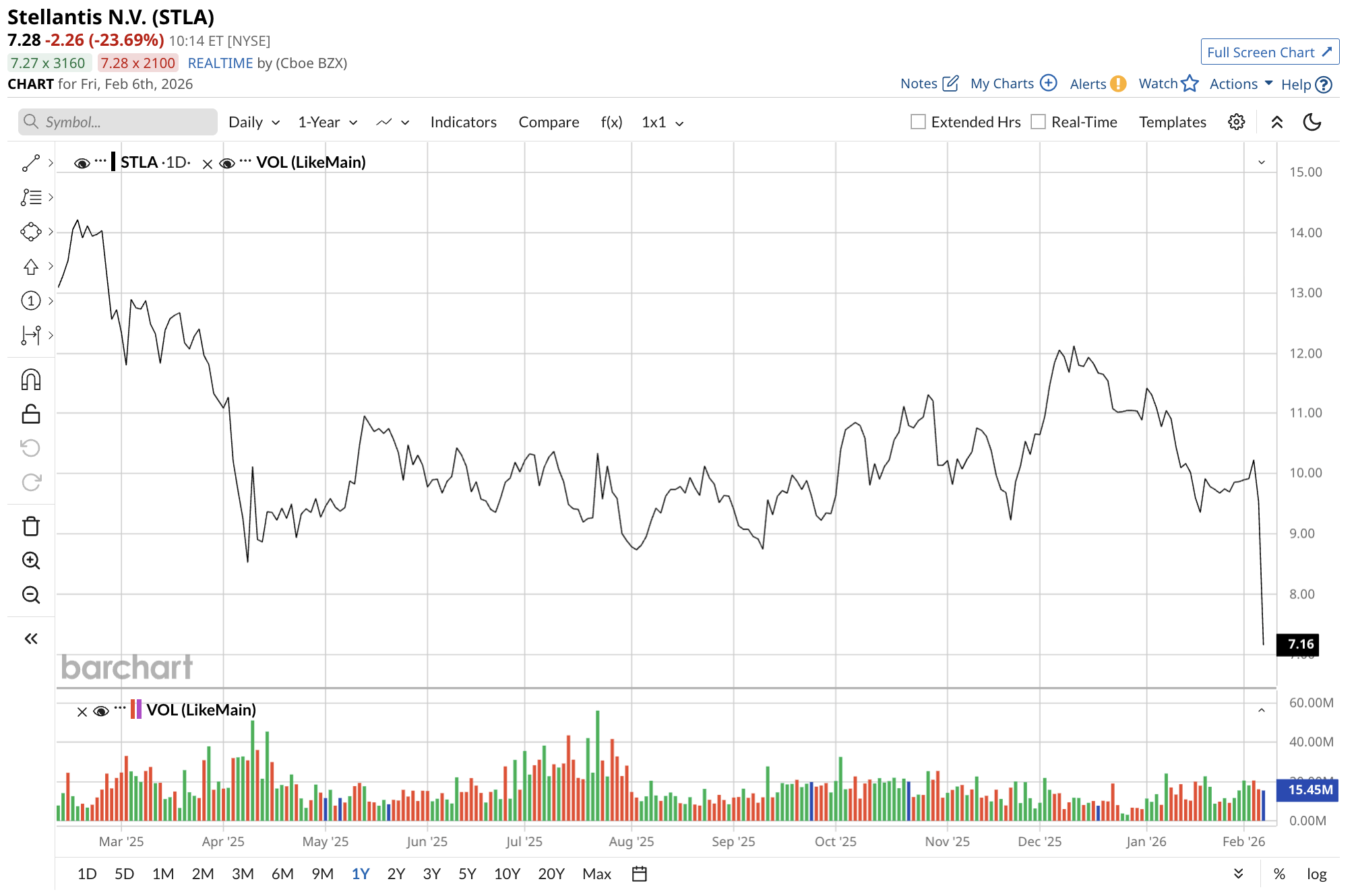 So far in 2026, STLA stock has tumbled 34% year-to-date, far underperforming the S&P 500's ($SPX) modest 1.2% gain over the same period. It is crashing 25% today, and over the past year, shares are down 45%, versus the S&P's 12.16% advance. Valuation metrics paint a bargain picture: forward P/E at 6.35, below the auto industry average of 8 to 10; forward P/S at 0.17, half the sector's 0.4 to 0.6; P/B at 0.36, versus the industry's 1.2 to 1.5; and P/CF around 1.9, under historical norms of 4 to 6. These ratios suggest undervaluation—a low P/S indicates cheap revenue multiples, P/B shows assets exceed market cap, and P/CF highlights strong cash generation relative to price—making STLA appealing for value investors despite headwinds, at least on the surface.