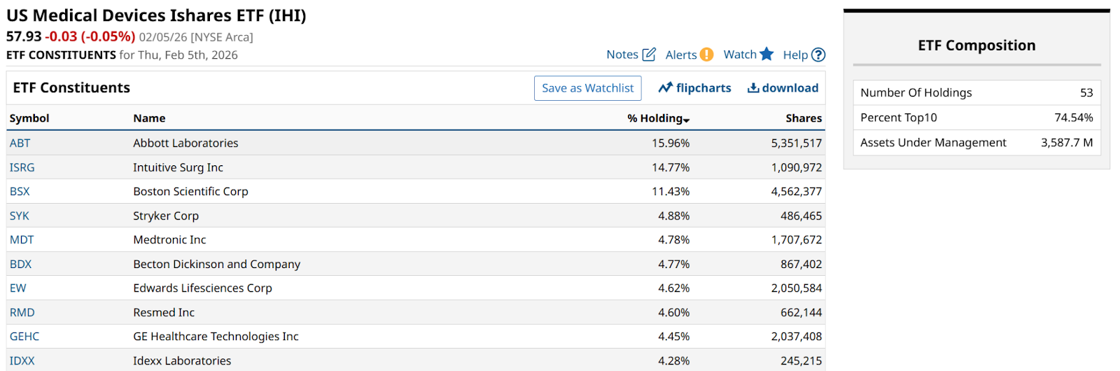 Here are IHI’s top 10, which make up nearly three-quarters of the entire exchange-traded fund (ETF). A mix of household names to consumers and familiar names to professional investors.