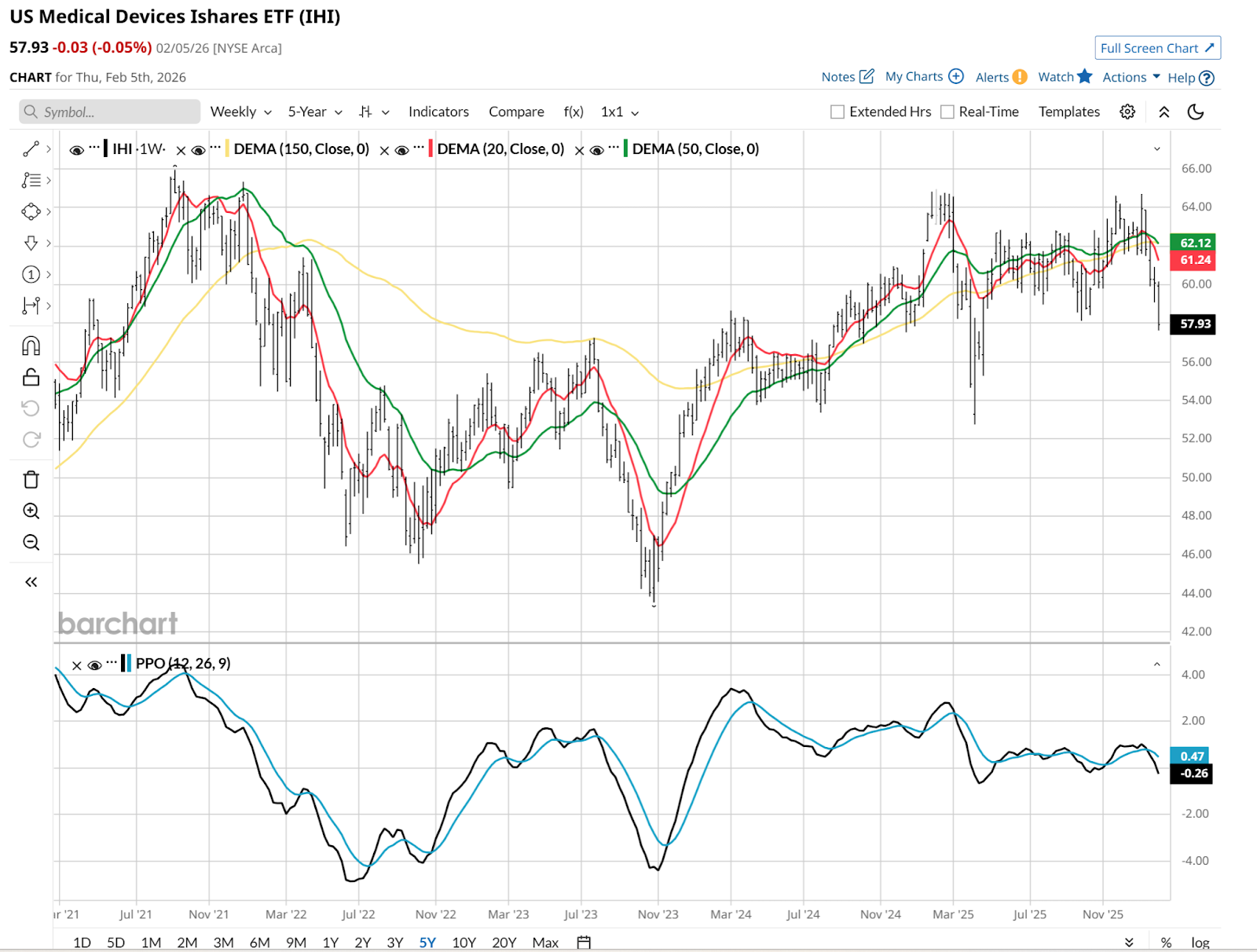 The medical device sector, tracked by IHI, is currently in a "show me" phase. It has underperformed the broader S&P 500 for a while, and there’s too many headwinds that have to subside before I can see green here again.