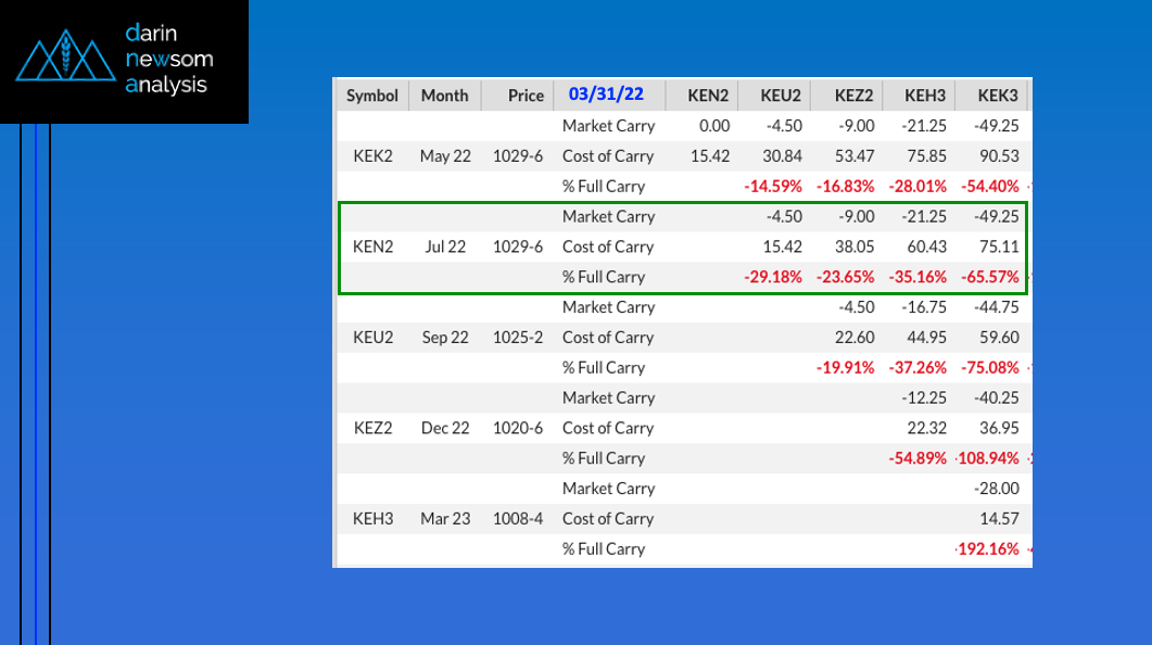 Take a look at the attached Cost of Carry table from Barchart for the HRW wheat market at the end of March. The new-crop 2022-2023 July-to-May forward curve closed at an inverse of 49.25 cents. Recall from previous discussions that in a storable commodity like wheat an inverse, any inverse, is an indicator of bullish fundamentals. So what do we know about US HRW wheat supply and demand? First, with the cmdty National HRW Wheat Price Index (KEPAUS.CM) calculated at $10.27 we know old-crop supplies are tight in relation to demand, part of my latest 2021-2022 US all wheat available stocks-to-use calculation of 21.3% as compared to my ending stocks-to-use calculation of 39.1% for 2020-2021. Second, the strong inverse in the 2022-2023 forward curve tells us the commercial is convinced supplies, the combination of beginning stocks (old-crop ending stocks) and production (acres X yield) aren’t going to be enough to offset demand and rebuild the US stockpile.