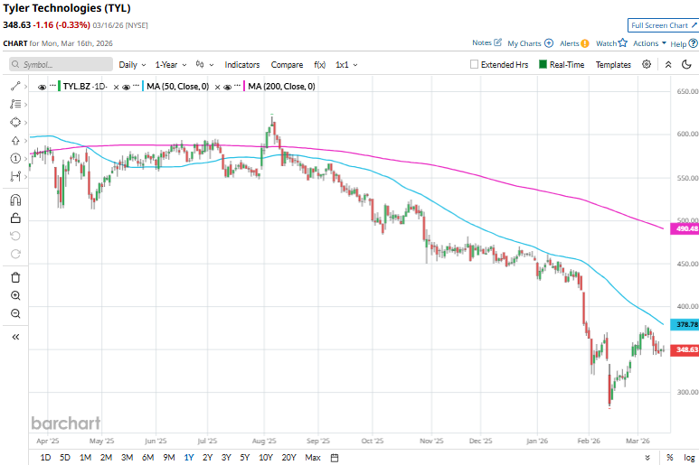 Tyler Technologies has trailed the broader market over the past year primarily due to earnings misses and a slower, more uneven growth profile, which have weighed on investor confidence. Its reliance on government spending cycles, which are typically slower and less flexible than private-sector demand, limits upside during strong market rallies.