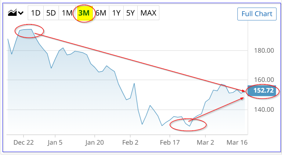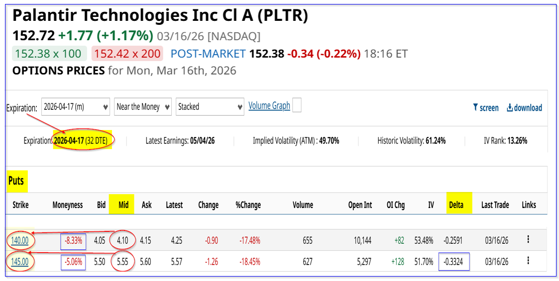 The premium has risen from $27.95 on Feb. 24 to $44.83 as of March 16. That represents a +60.4% gain (i.e., $44.83/$27.95 = 1.604)in the last 3 weeks, vs. a 17.8% rise ($152.17/$129.18 -1 = 1.178) in PLTR stock in the same period.