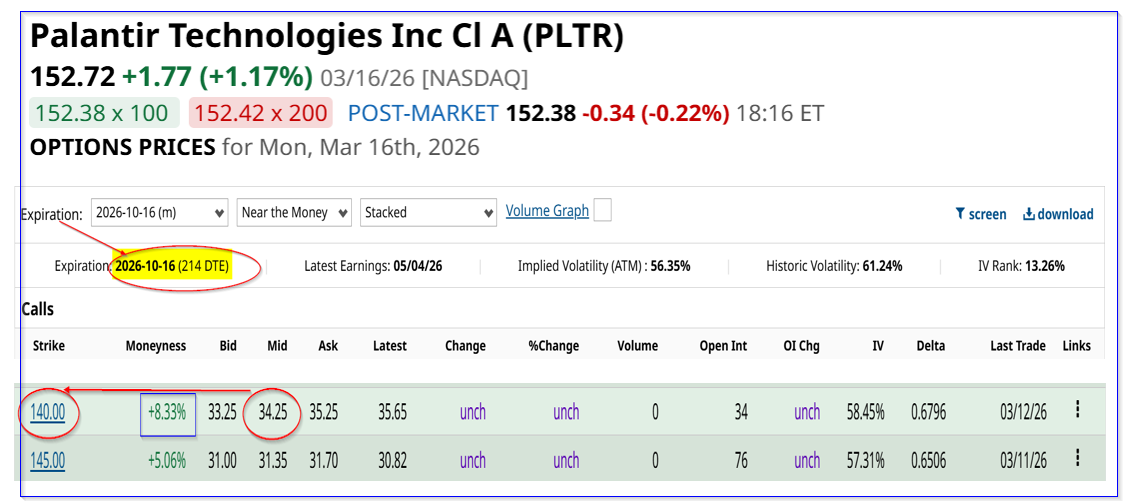 New investors in PLTR can consider buying new ITM 7-month calls. For example, the Oct. 16, 2026, expiry period shows that the $140 PLTR call option costs $34.25.
