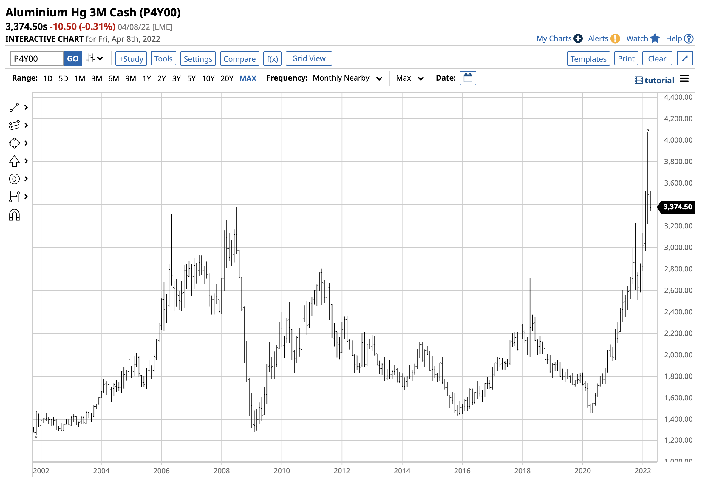 Three-month LME aluminum forwards spiked to a new record high of $4,073.50 per ton in March and settled at $3,491 on March 31, 2022. Aluminum is the most liquid metal on the LME as it trades the most volume, and tin is the least liquid, and it also reached a record high in Q1.Â