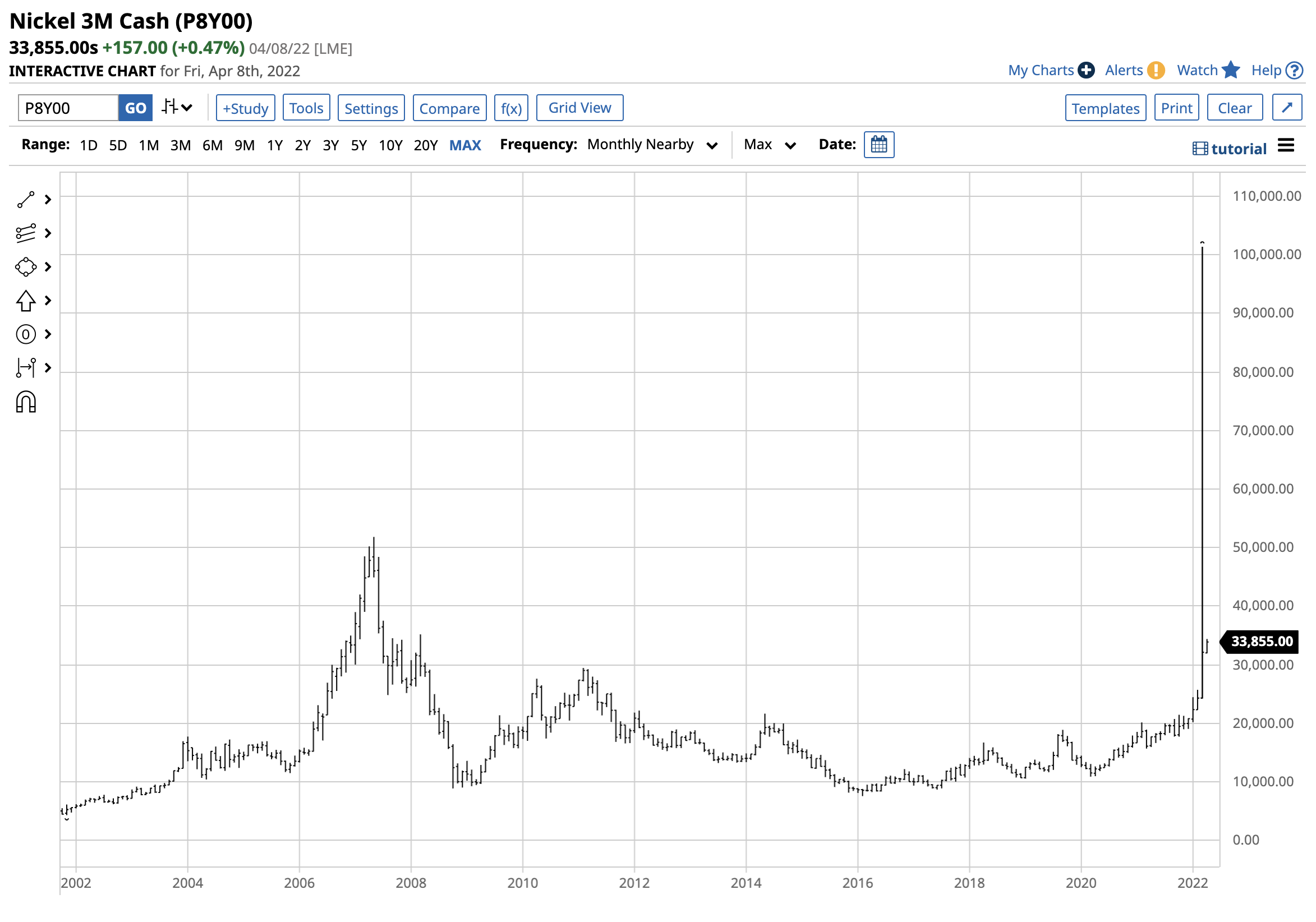 Russia is one of the leading nickel-producing countries. The war in Ukraine and sanctions pushed nickel prices to record highs. A short Chinese nickel producer faced margin calls that threatened the viability of the LME, causing the cancelation of trades and suspension of nickel trading in early March. After rising 24.99% in 2021, LME nickel exploded higher before imploding in Q1.Â