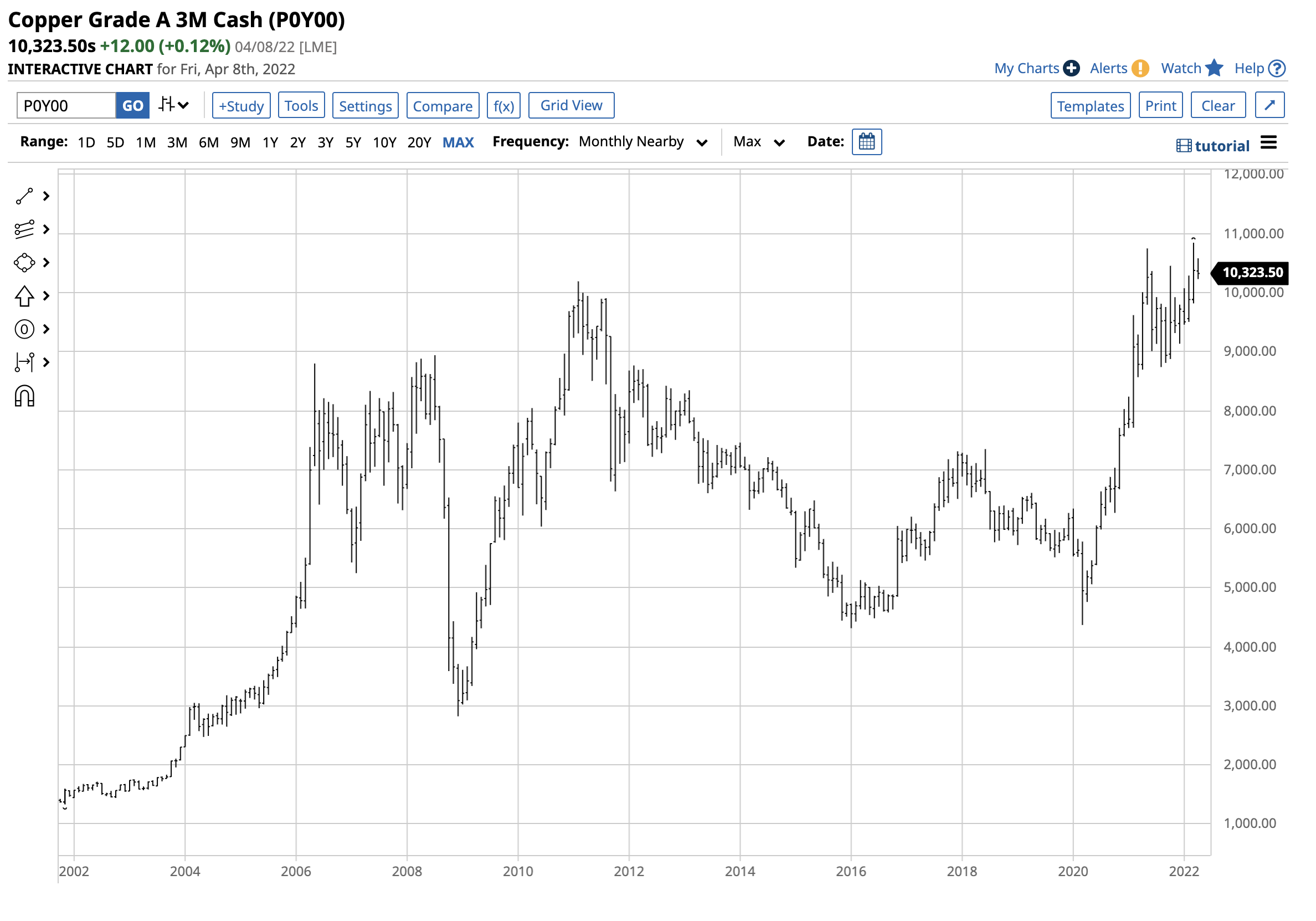 LME copper forwards moved 25.31% higher in 2021 and added another 6.73% over the first three months of 2022.Â
