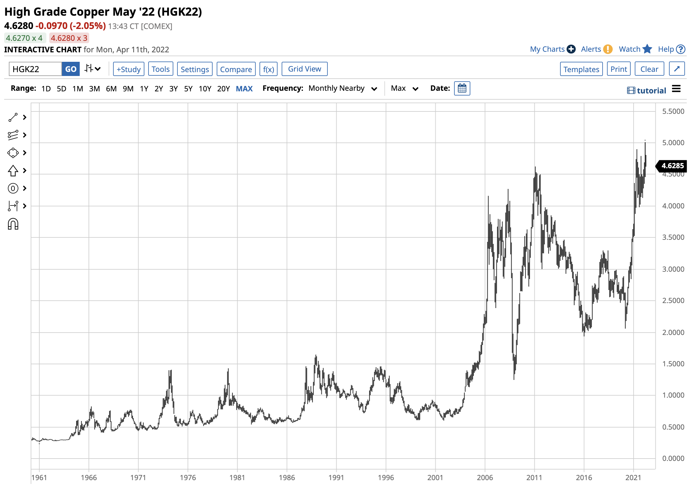 The chart shows that the futures probed over the $5 level for the first time in March, reaching a high of $5.01 per pound. The COMEX futures settled at $4.7510 on March 31, 2022.Â