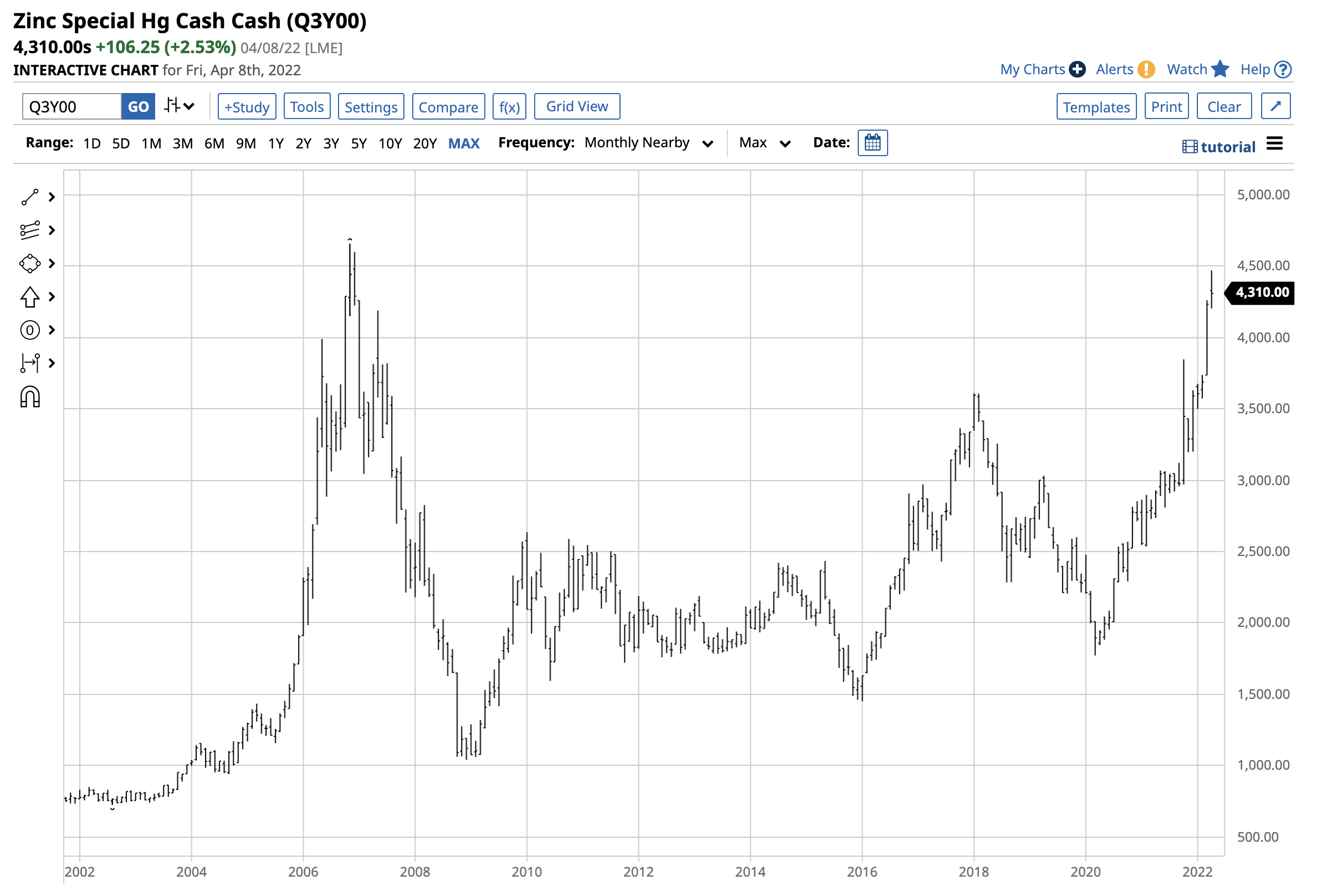 Zinc prices gained 28.74% in 2021 and added 18.10% in Q1 2022.Â