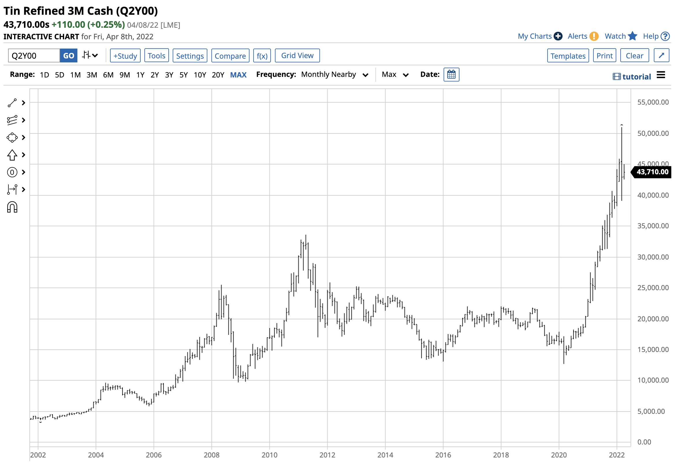 The chart shows that LME tin forwards reached a record high of $51,000 per ton in March. Tin was 91.52% higher in 2021 and moved another 10.42% to the upside in Q1, closing at the $42,910 per ton level on March 31.Â