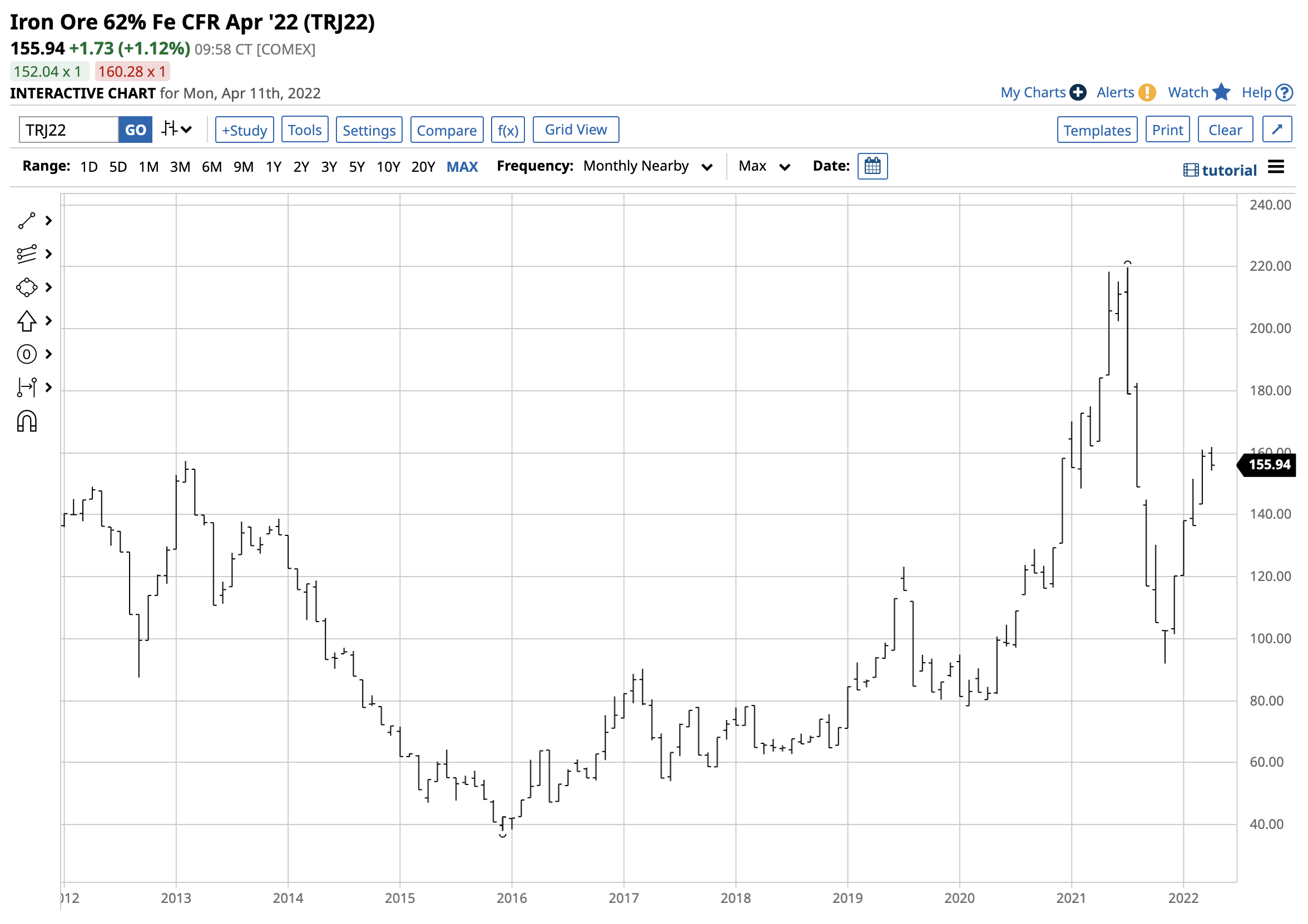Iron ore reached a record high at $219.77 per ton in July 2021 before correcting. Iron ore declined by 24% in 2021, but the price moved 32.12% higher in Q1 2022.Â
