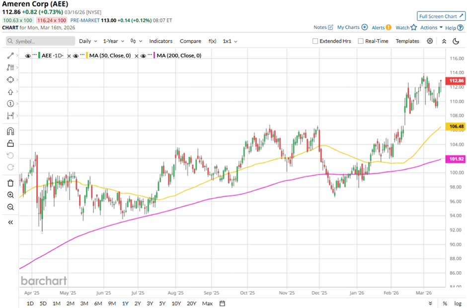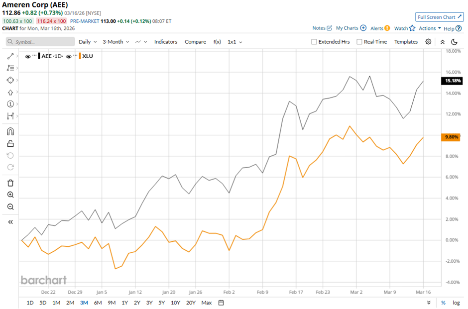 Shares of the Saint Louis, Missouri-based company have dipped marginally from its 52-week high of $113.64. AEE stock has soared 14.7% over the past three months, outperforming the State Street Utilities Select Sector SPDR ETF's (XLU) 10.6% gain during the same period.