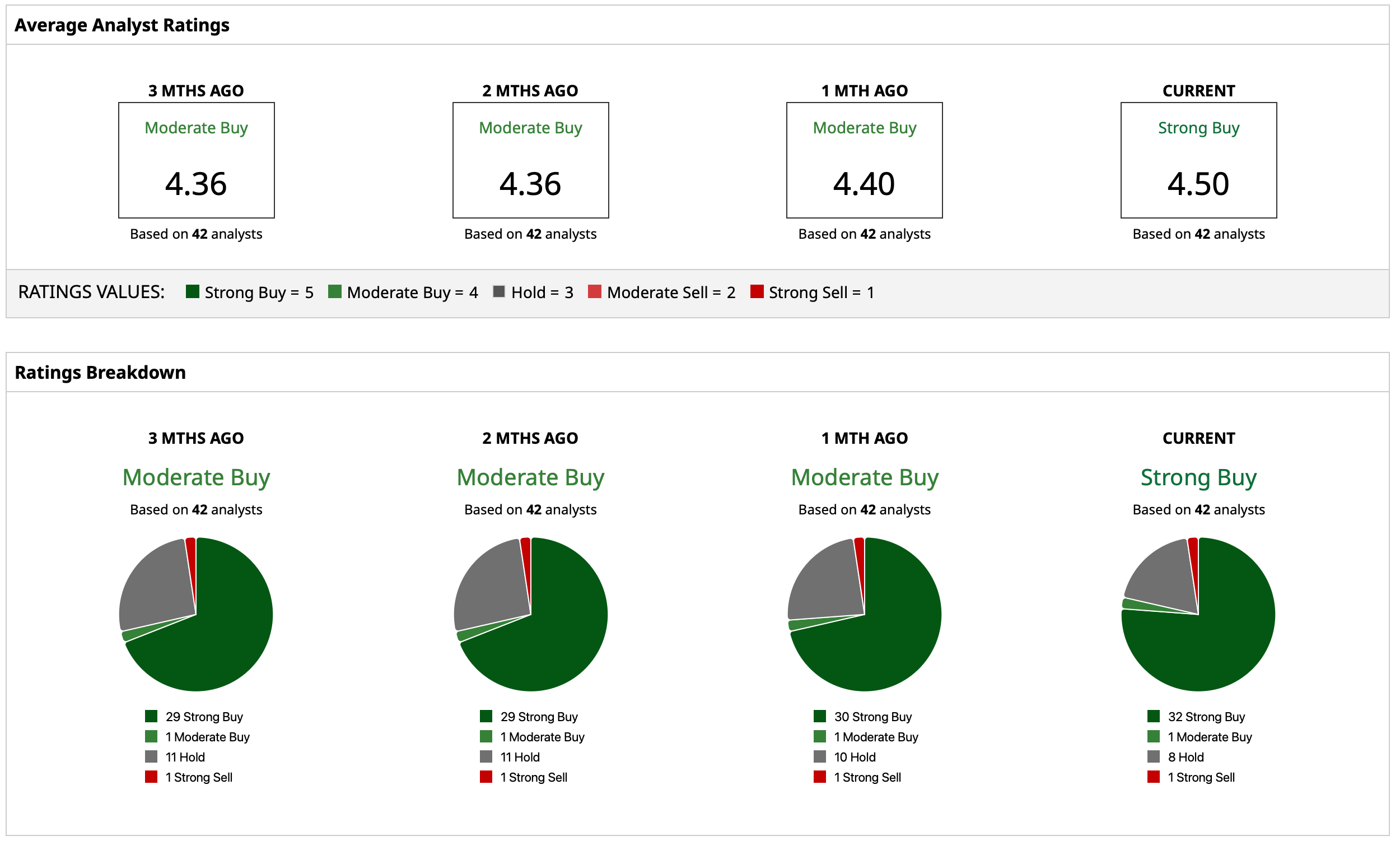 Analysts give ORCL stock a “Strong Buy” consensus rating. The mean target price of $264.44 indicates potential upside of about 70% from current levels. Out of 42 analysts covering the stock, 32 have a “Strong Buy” rating, one has a “Moderate Buy,” eight analysts have a “Hold” rating, and one has a “Strong Sell.”