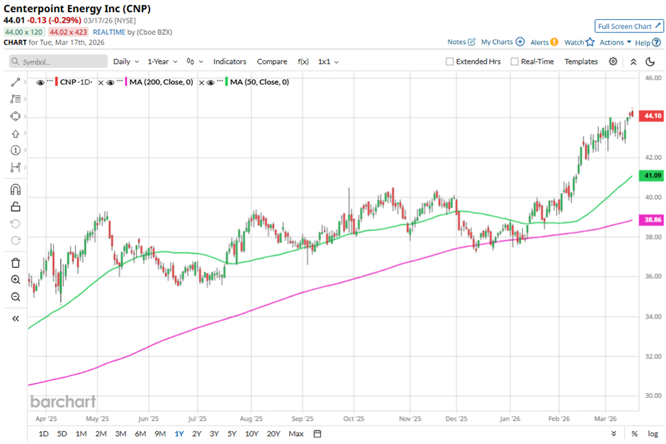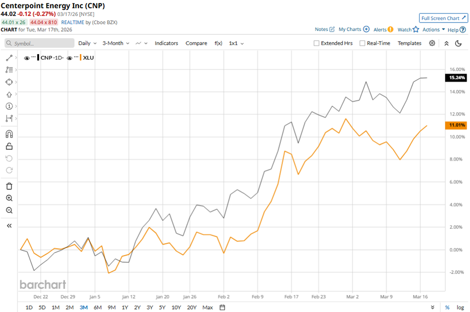 Shares of the Houston, Texas-based company have fallen marginally from its 52-week high of $44.39. CNP stock has increased 16% over the past three months, outpacing the State Street Utilities Select Sector SPDR ETF's (XLU) 10.9% gain during the same period.