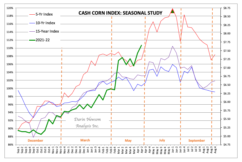 - The cmdty National Corn Price Index, the intrinsic value of the market, shows a seasonal pattern of rallying through the first week of June.