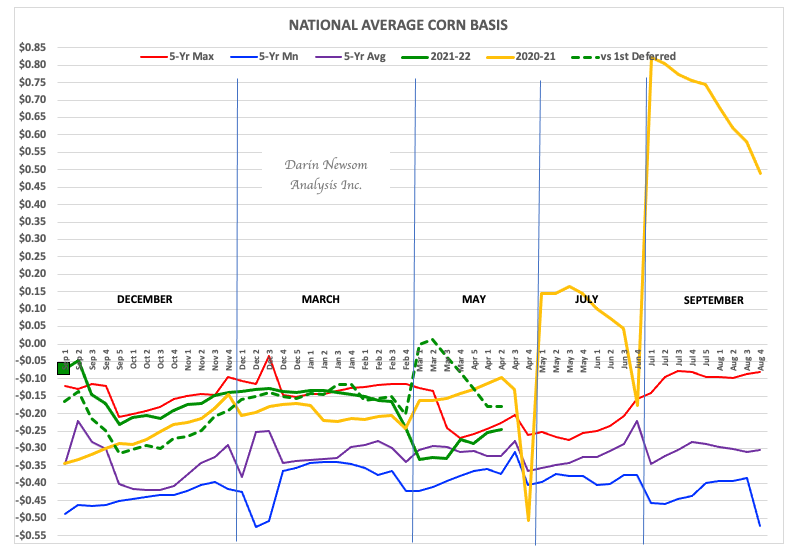 Additionally, the cmdty National Corn Basis Index (NCBI, weighted national average basis) shows a five-year average weekly close the first week of June of 32 cents under July futures, with a high previous 5-year weekly close of 25 cents under July. If we continue to see basis hold firm, and I expect it will, the upside target area for July futures the same first week of June would be $8.90 to $8.97. The July futures contract (ZCN22) was sitting near $7.91 early Monday morning.