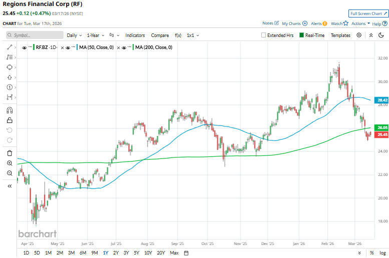 With a market cap of $21.9 billion, Regions Financial Corporation (RF) is a prominent regional bank holding company that provides a broad range of retail and commercial banking, wealth management, and mortgage services. Headquartered in Birmingham, Regions operates primarily across the Southern and Midwestern United States, serving individuals, small businesses, and large corporate clients.