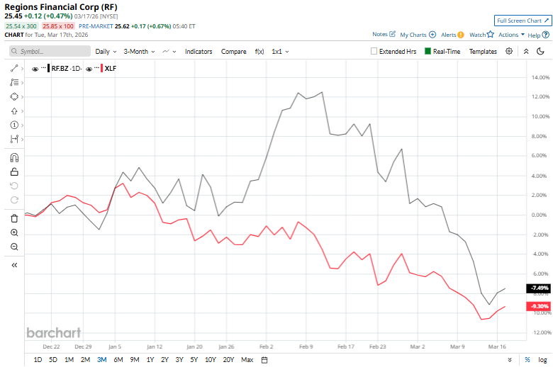 Shares of Regions Financial fell more than 5% on Feb. 27, alongside a broad selloff in banking and credit-related stocks, as the collapse of a UK private lender heightened investor concerns about rising loan defaults.