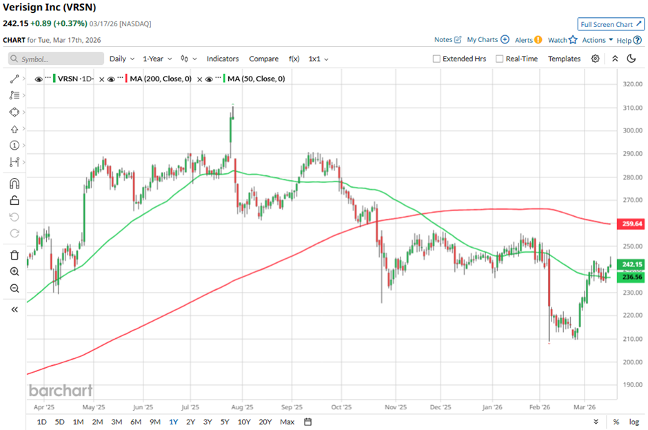 With a market cap of $22.2 billion, VeriSign, Inc. (VRSN) is a global provider of internet infrastructure and domain name registry services that enable reliable navigation across widely used domain names. The company operates critical internet functions, including maintaining two of the thirteen root servers and providing registration and authoritative resolution for .com and .net domains that power global e-commerce.
