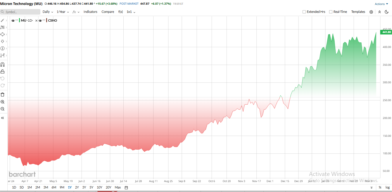 On March 13, Wedbush Research hiked its MU target to $500 and kept an “Outperform” rating. Wedbush said it calculated $500 by applying 5× its forecast of FY2027 EPS plus net cash. In other words, it’s pricing in very strong future profits, yet still “below typical peak” memory multiples.