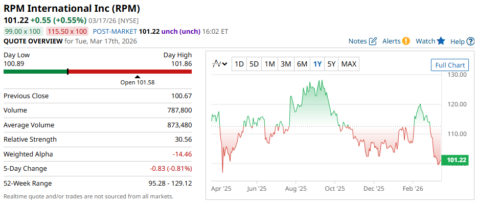 On the topic of dividends, RPM has increased its payouts for 52 consecutive years. It currently pays a forward annual dividend of $2.16, translating to a yield of about 2.1%.