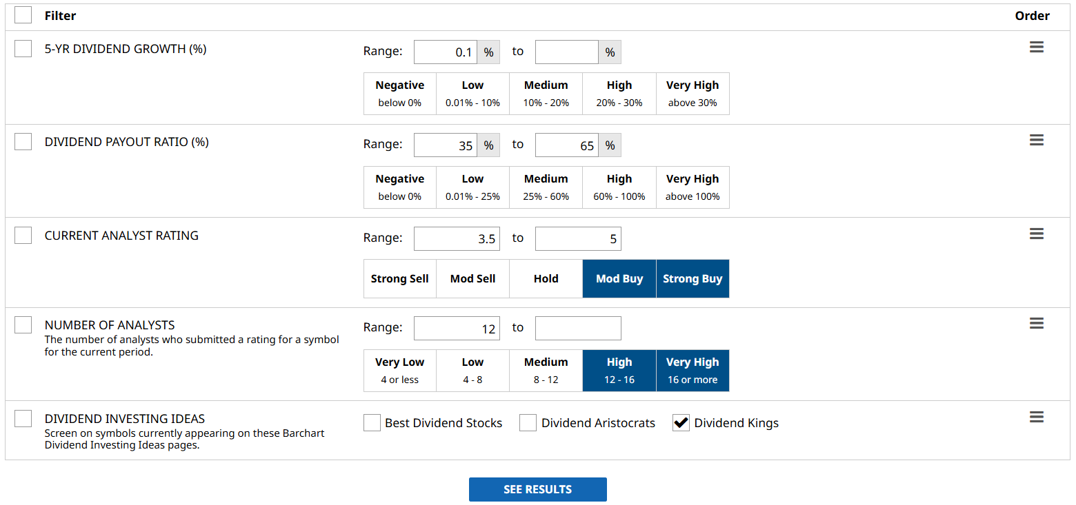 Using Barchart’s Stock Screener, I selected the following filters to get my list: