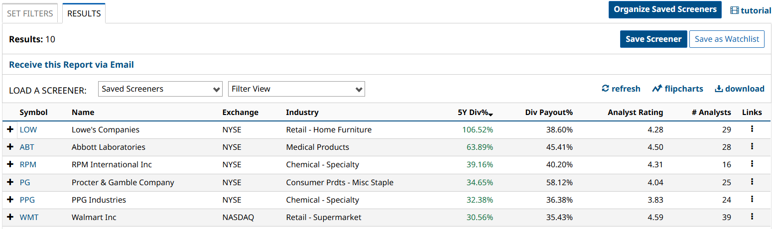 With this screen, I got 10 results and will cover three Dividend Kings with the highest 5-yr dividend growth.