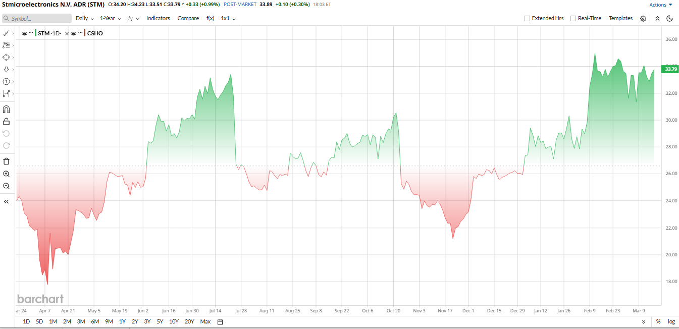 Valued at $13 billion by market cap, STM stock has bounced back strongly in the last year. The shares delivered a roughly 31% total return over the past 12 months and are up about 30% year-to-date (YTD). This outpaced many chip peers, helped by recovering auto/industrial demand and the recent AI buzz.