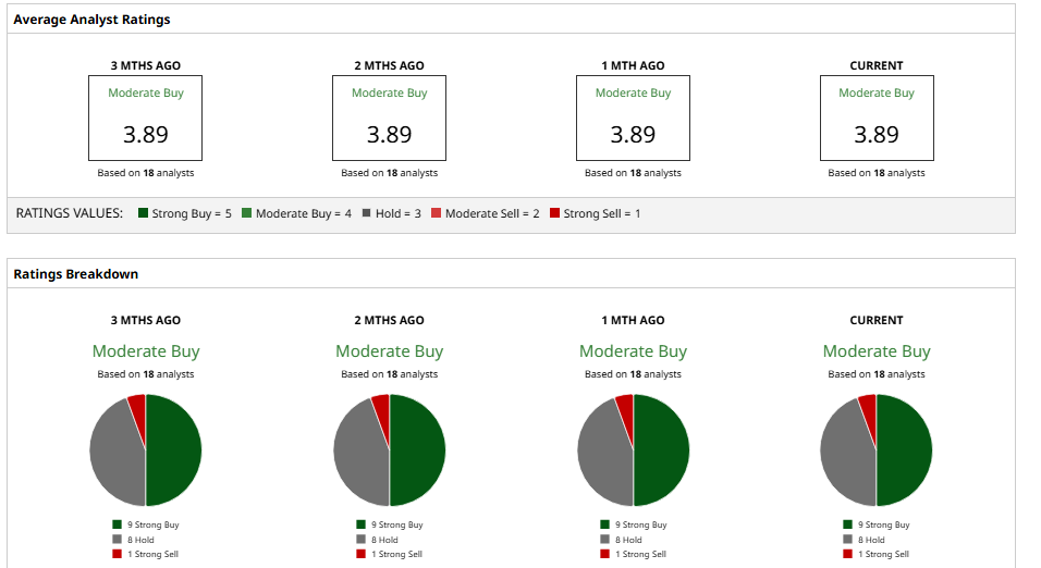Wall Street’s opinion on STM stock is generally positive, evidenced by their consensus “Moderate Buy” rating. The consensus 12-month price target is only around $34, roughly flat to slightly below the current price. However, the street high target of $45 still implies an expected 32% upside.