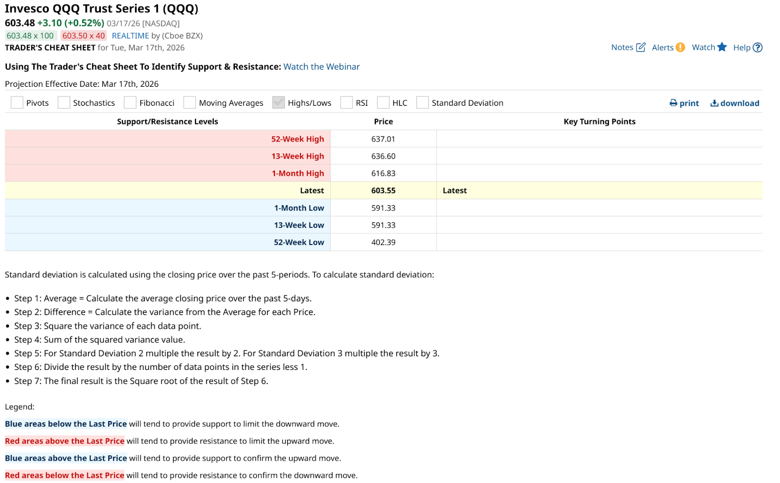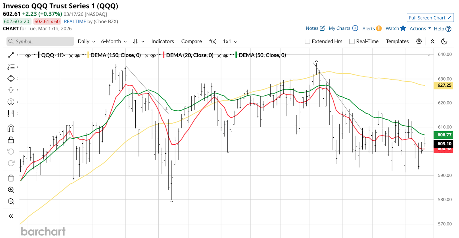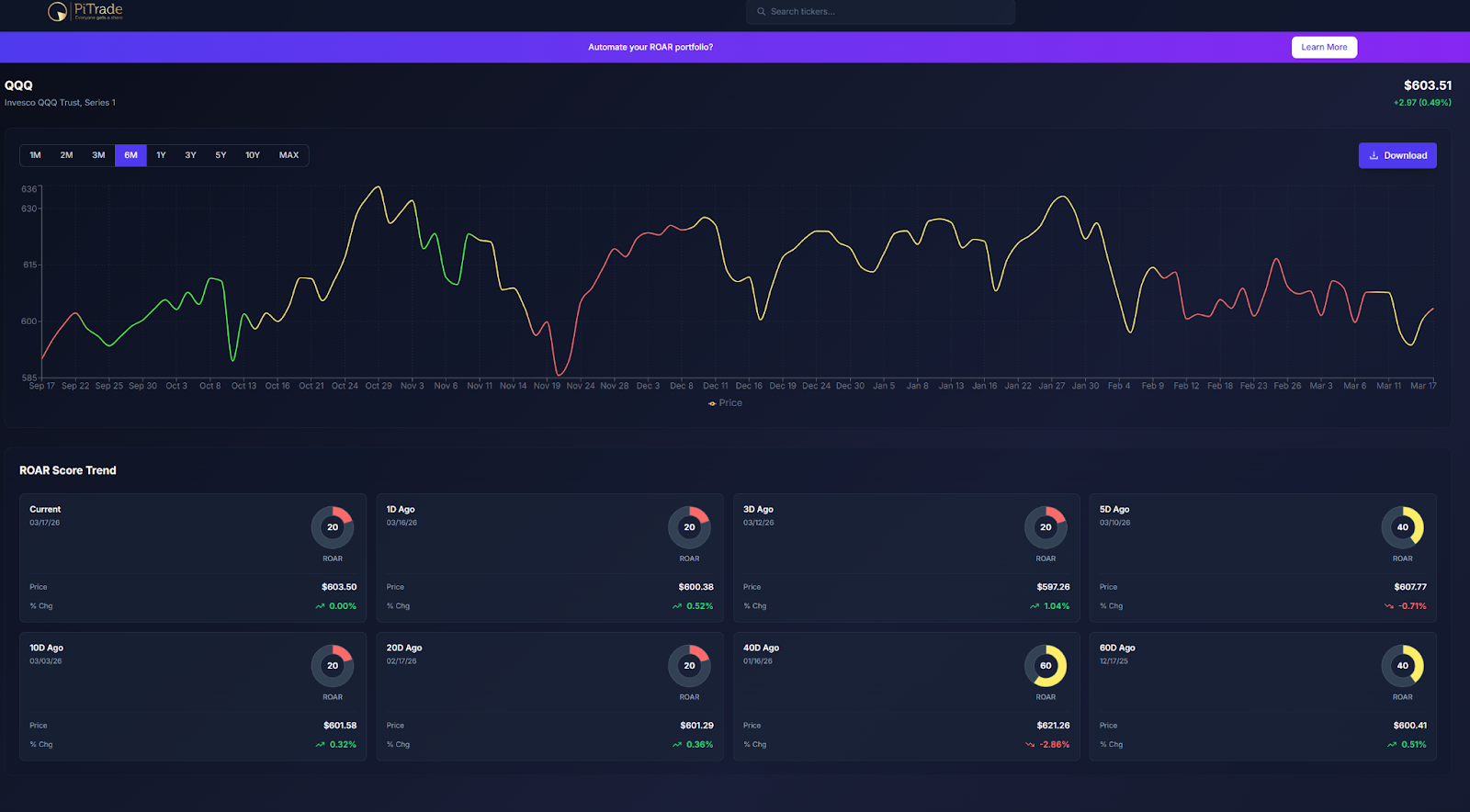 My ROAR score is, as any other indicator, not perfect. But it has been a solid guide through QQQ’s recent six-month malaise. The score currently sits at 20, which indicates solid higher-than-normal risk. It last signaled lower-than-normal risk (a score of 70 or higher) on Nov. 10, 2025, when QQQ was at $623. It has waffled between yellow (average risk) and red since that time.