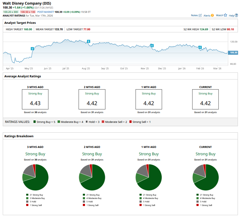Brokerages are quite upbeat on DIS stock, and it has a consensus rating of “Strong Buy” from the 31 analysts polled by Barchart. The stock’s mean target price is $133.70, which is 33% higher than the current price.