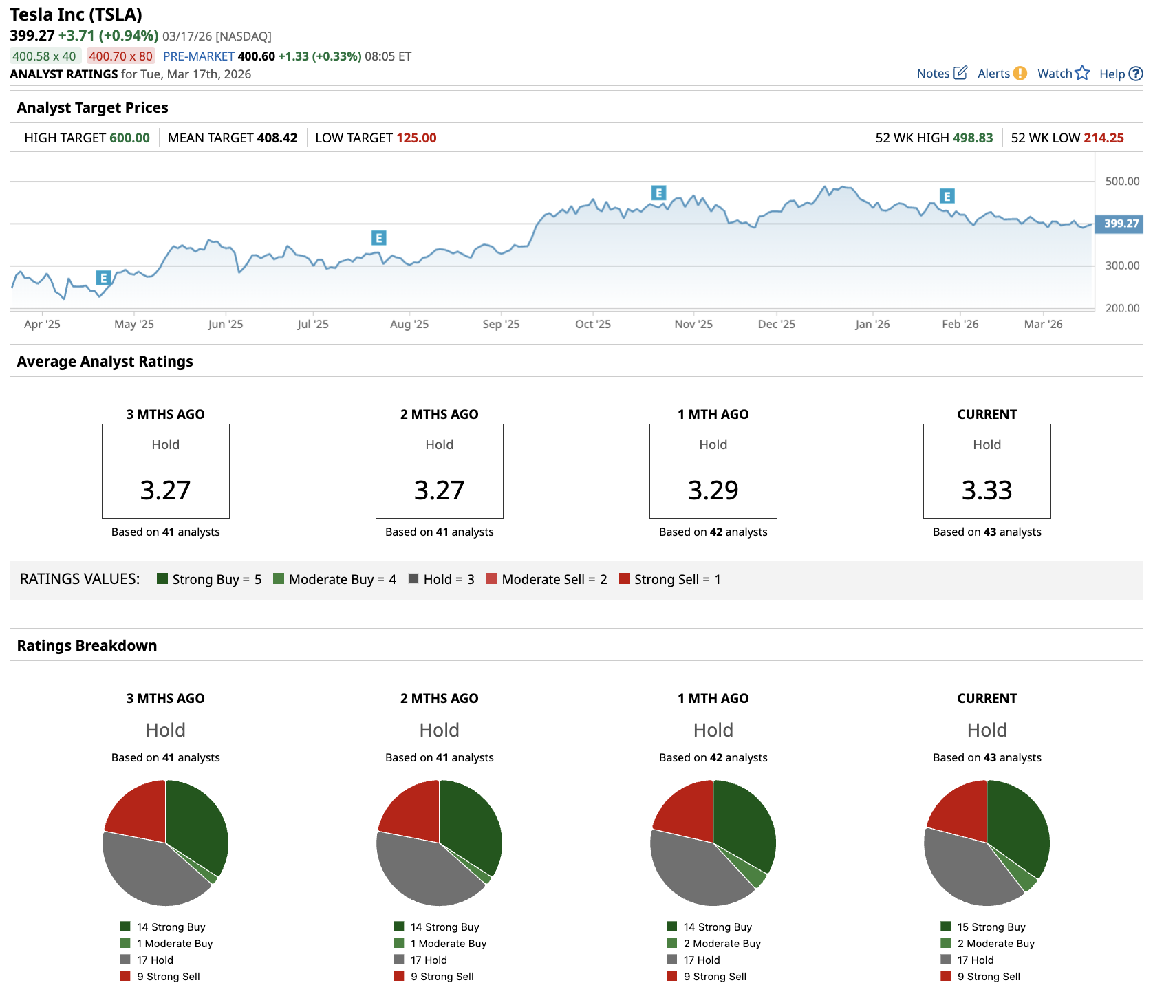 Out of the 43 analysts covering TSLA stock, 15 recommend “Strong Buy,” two recommend “Moderate Buy,” 17 recommend “Hold,” and nine recommend “Strong Sell.” The average TSLA stock price target is $408.42, above the current price of about $400.