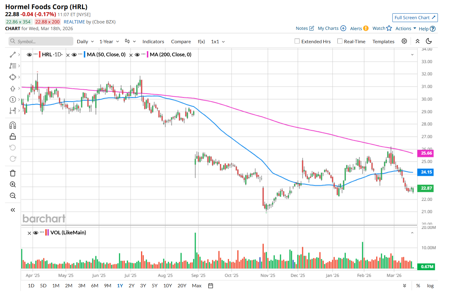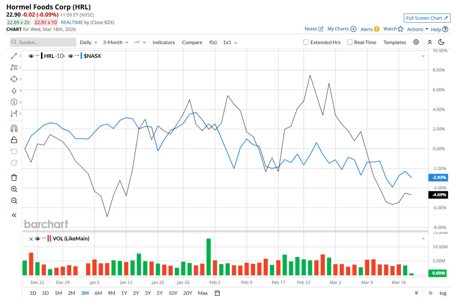 This packaged food company has slipped 28.5% from its 52-week high of $32.07, reached on Apr. 4, 2025. Shares of HRL have declined 4.5% over the past three months, underperforming the Nasdaq Composite ($NASX) 3% drop during the same time frame.