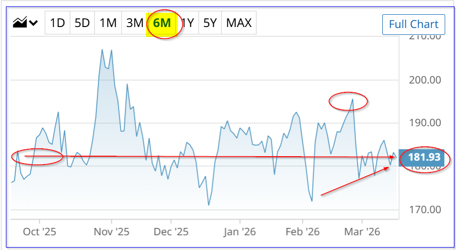 NVDA closed at $181.93 on Tuesday, March 16, well below its pre-earnings Feb. 25 peak of $195.56, but up from a recent low of $171.88 on Feb. 5. But Barchart shows that NVDA stock has been relatively flat over the last 6 months.