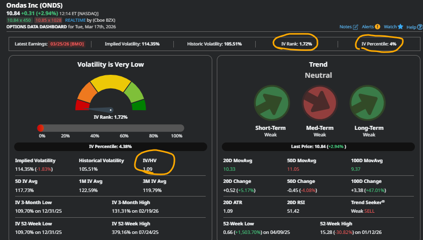Lastly and further supporting long premium positioning in Ondas, ONDS stock’s IV Percentile points to implieds which have only been lower 4% of the time in the last 52 weeks.