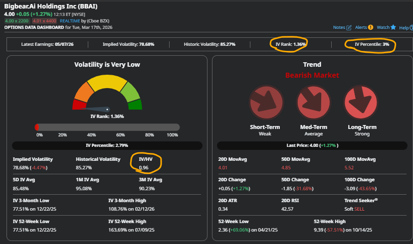 This stat tells options investors that BigBear’s calls and puts have only traded at lower implieds 3% of the time over the past year.