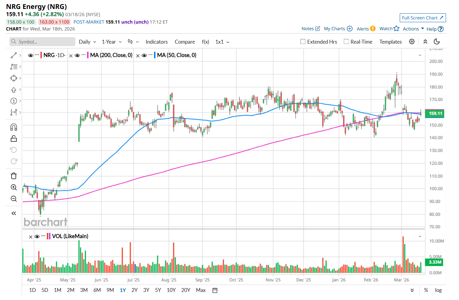 To confirm its recent bearish trend, NRG has been trading below its 200-day and 50-day moving averages since early March.