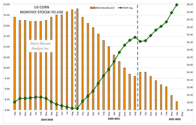 Fundamentally, what will we know about old-crop corn at the end of today that we don’t know this morning? Nothing. My end of April US available stocks-to-use calculation, based on the marketing year daily average price of the Barchart National Corn Price Index (ZCPAUS.CM), came in at 8.4% as compared to the previous month’s 8.7% and previous April’s 10.6%.