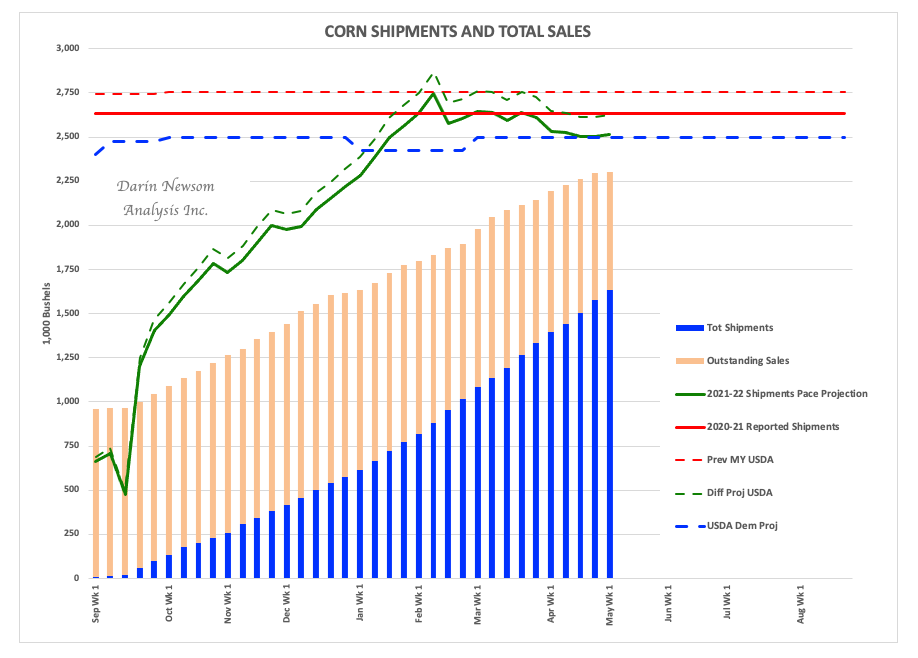 As for new-crop, all we need to know can be seen in the inverted Dec22-to-July23 forward curve. This tells us the commercial side believes, at least for now, 2022 production (acres, yield, etc.) will not be enough to loosen the tight supply and demand situation.