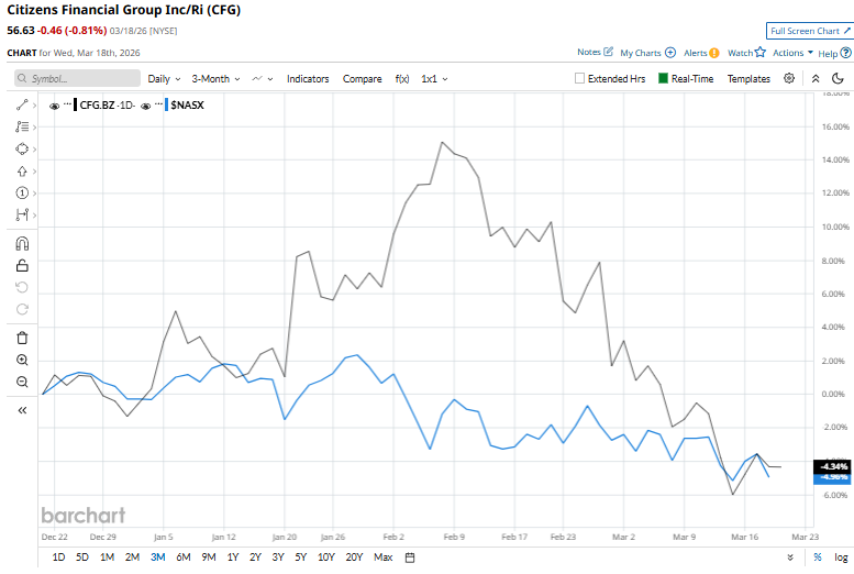 The stock reached a 52-week high of $68.79 on Feb. 11 and is down 17.7% from that level. With its shares down almost 3.1% over the past three months, CFG surpasses the broader Nasdaq Composite’s ($NASX) fall of 5% over the same time frame.
