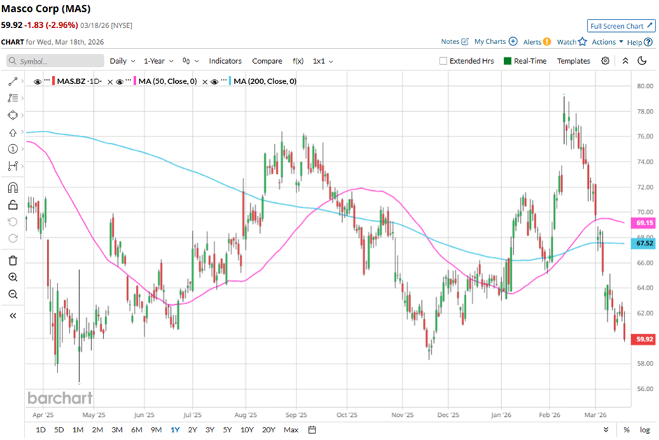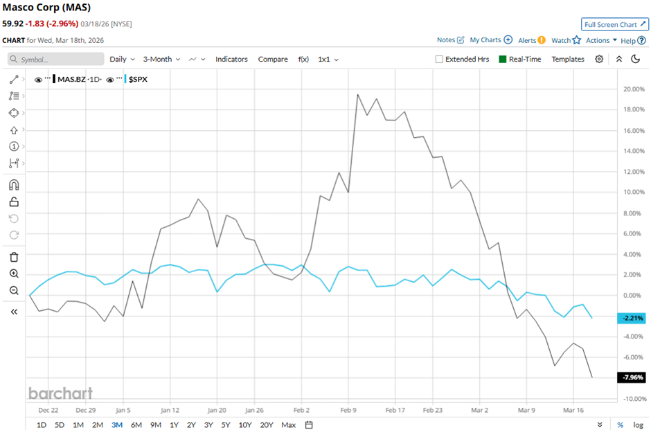 Shares of the building products & equipment manufacturer have pulled back 24.3% from its 52-week high of $79.19. MAS stock is down 8% over the past three months, underperforming the broader S&P 500 Index's ($SPX) 3.1% drop in the same period.