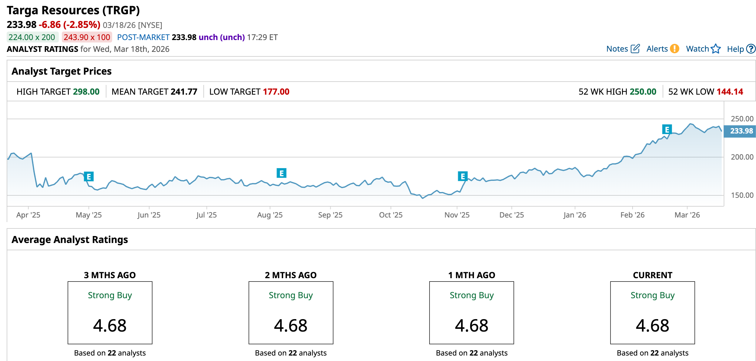 Overall, Wall Street remains highly optimistic about Targa, with the stock carrying a consensus “Strong Buy” rating. Of the 22 analysts covering the stock, 18 recommend “Strong Buy,” one suggests “Moderate Buy,” while three maintain a “Hold.” The average price target of $241.77 points to 3.3% upside from current levels, but the Street-high target of $298 implies the stock could still rally by as much as 27.4%, highlighting lingering bullish conviction.