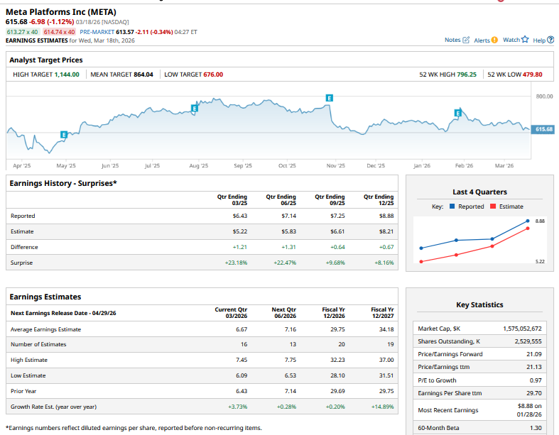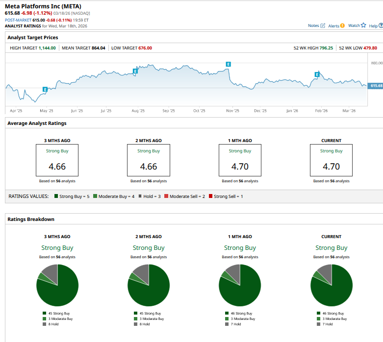 Despite the dip, brokerages are quite upbeat on META stock, and it has a consensus rating of “Strong Buy” from the 56 analysts polled by Barchart. The stock’s mean target price is $864.04, which is 42% higher than the current price levels. Here, it is worth noting that sell-side analysts haven’t tweaked their target prices for Meta—or, for that matter, many other stocks—amid the Iran war. However, the conflict has continued for much longer than some expected, and there looks to be no off-ramp for now.