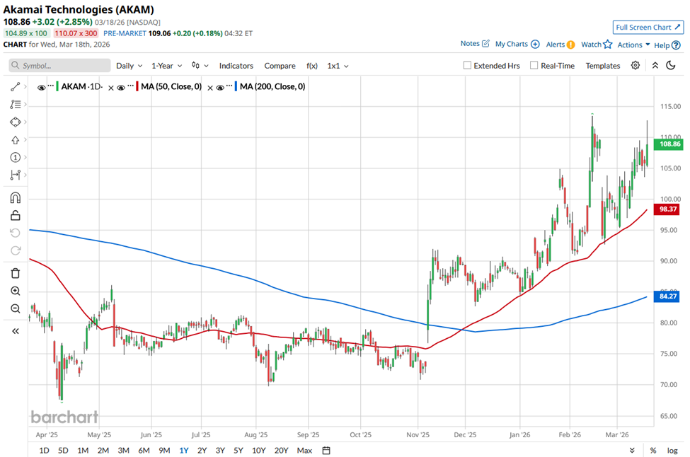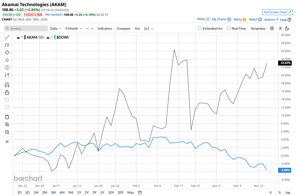 AKAM stock is down nearly 4% from its 52-week high of $113.50, reached on Feb. 13. Shares of Akamai have surged 22.2% over the past three months, outperforming the Dow Jones Industrials Average’s ($DOWI) 4.4% decline during the same period.