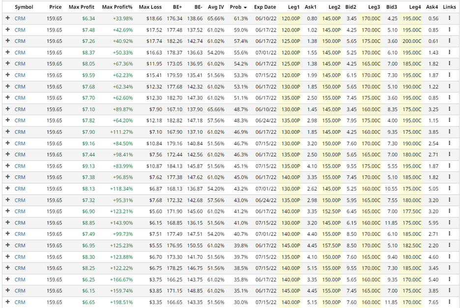 The second stock on our high implied volatility screener was Salesforce. Here are the iron condor screener results for CRM: